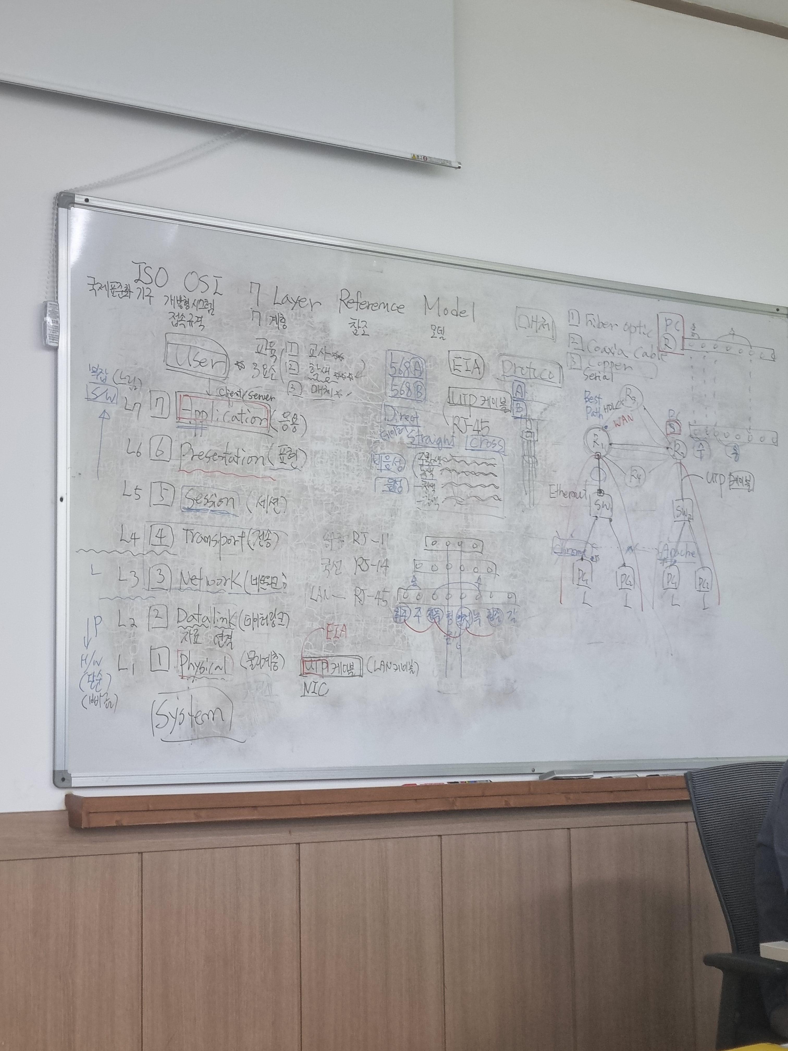 오늘은 7 계층에 대하여 배웠다 근데 솔직히 어느정도는 이해가 되지만 글로 정리를 못하겠다....훌륭한 스승님 밑에 처참한 제자다.... 계속 수정해야겠다.. ISO OSI 7계층(7 layer Reference(참조) model1(모델)) 핵심!!! 이해한다면 네트워크의 대부분 이해한다 국제표준화 기구 개방형 시스템 접속규격 7계층은 컴퓨터가 완벽히 구현한다 TCP(4계층)/IP(3계층) 4계층 2계층까지만 준비가 되있다면 준비가 된거다.하드웨어(육체)와 소프트웨어(정신)가 같이 준비되어야한다계층을 올라가면 올라갈수록 S/W 내려갈수록 H/W계층이 내려가면 내려갈수록 시스템과 가까워진다. ------- 유기적으로 작동한다 1계층 L(Layer)1 physical (물리계층) 비트 - H/W 를 물리계..
